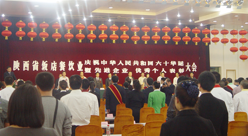 2009年9月24日,由陜西省飯店協會舉辦地陜西省飯店餐飲業慶祝中華人民共和國六十周年暨先進企業、優秀人物表彰大會在西安舉行,陜西省商務廳副廳長宋民生、中國飯店協會副秘書長平安穩出席會議,陜西省企業信用協會常務副會長、秘書長王平安應邀出席。 活動旨在回顧和展示我省飯店餐飲行業60年的發展歷程,總結我省飯店餐飲行業60年,特別是改革開放30年來的巨大變化。通過評比表彰,樹立一批行業的標兵和榜樣,進一步推動我省飯店餐飲企業取得更大發展。西安喜來登大酒店、西安唐華賓館等68家賓館(酒店)分別獲得“陜西十佳飯店賓館(酒店)”、“陜西十佳會議/商務接待單位”、“陜西十佳婚宴/壽宴接待單位”、“陜西十佳餐飲服務單位”榮譽稱號,另有65位餐飲業優秀個人分獲“陜西飯店餐飲業十佳優秀企業家”、“陜西飯店/餐飲業優秀職業經理人”、“陜西飯店餐飲業十佳服務標兵”、“陜西飯店餐飲業十佳行政總廚”榮譽稱號。 會議還向全省飯店餐飲業企業發出宣傳貫徹國家標準,創建綠色飯店倡議書,陜西省飯店協會常務副會長李謙主持會議。