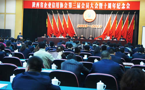 2013年4月24日,陜西省企業信用協會第三屆會員代表大會暨成立十周年紀念大會在陜西丈八溝賓館舉行,陜西省委原書記安啟元,省人大原副主任劉遵義、省政協原副主席朱振義,全國工經聯副會長、省國資委原主任邱世杰,陜西省政協委員、省企業信用協會常務副會長、秘書長王平安,省國資委副巡視員劉根科,省商務廳副巡視員李升良,省發改委副巡視員閆自全等負責同志以及協會歷屆領導,共建單位的有關負責同志、會員代表、部分省市信用組織代表、省內相關協會代表、有關專家學者三百余人參加了會議。