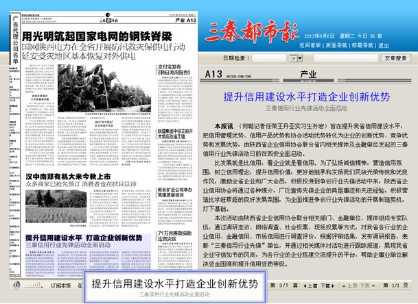2013年8月6日,《三秦都市報(bào)》在產(chǎn)業(yè)版A13,刊發(fā)了以《提升信用建設(shè)水平,打造企業(yè)創(chuàng)新優(yōu)勢(shì)》為標(biāo)題,展開對(duì)陜西省企業(yè)信用協(xié)會(huì)開展“三秦信用行業(yè)先鋒”活動(dòng)的專題報(bào)道。