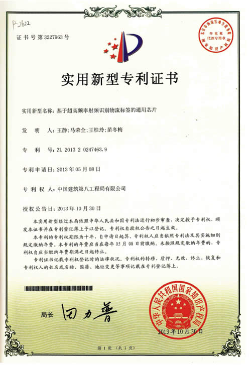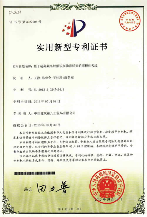 陜西省企業信用協會學術委員會主任王靜博士榮獲由中華人民共和國知識產權局頒發的兩項實用新型專利證書,兩項專利分別是“基于超高頻率射頻識別物流標簽的通用芯片”和“基于超高頻率射頻識別物流標簽的圓極化天線”,這兩項發明專利,在實用新型技術應用方面有重大貢獻。王靜博士能獲此兩項殊榮,是她和她的發明團隊共同努力的結果。也證明了我會學術委員高超的發明創造能力和強勁的科研實力。