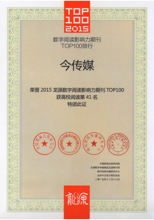 日前,從今傳媒官網獲悉,由中國新聞出版研究院和龍源數字傳媒集團聯合推出的2015年“TOP100數字閱讀影響力期刊排行榜單”發布,《今傳媒》《讀者》等期刊榮晉2015龍源數字閱讀影響力期刊TOP100。《今傳媒》獲高校數字閱讀影響力TOP100排行第41名,中國新聞出版研究院、龍源數字傳媒集團龍源期刊網、期刊網絡傳播研究中心、全球中文電子期刊協會共同為其頒發了“數字閱讀影響力期刊TOP100排行”榮譽證書。在此,對《今傳媒》獲此殊榮表示熱烈的祝賀!希望《今傳媒》再接再厲、再創輝煌,努力把《今傳媒》辦成國際知名、國內一流的專業傳媒學術期刊。