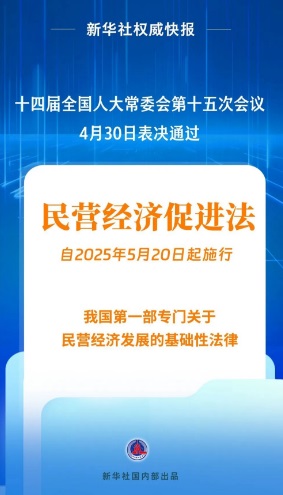 4月30日,十四屆全國人大常委會第十五次會議表決通過了《中華人民共和國民營經濟促進法》。法律共9章,包括總則、公平競爭、投資融資促進、科技創新、規范經營、服務保障、權益保護、法律責任、附則,自2025年5月20日起施行。 作為我國第一部專門關于民營經濟發展的基礎性法律,民營經濟促進法將進一步優化民營經濟發展環境,保證各類經濟組織公平參與市場競爭,促進民營經濟健康發展和民營經濟人士健康成長,構建高水平社會主義市場經濟體制,發揮民營經濟在國民經濟和社會發展中的重要作用。