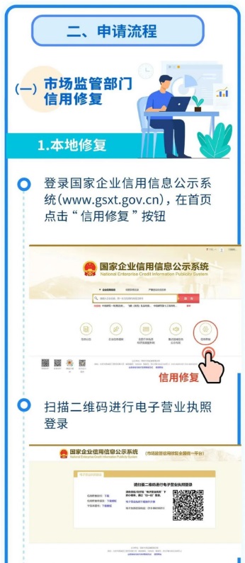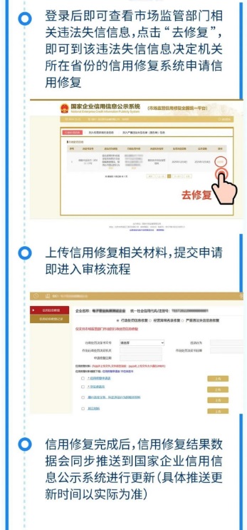 注意:部分市場監管部門提示 補報年報可免予行政處罰 可詢問當地市場監管局,是否:對未按時公示2024年年度報告的經營主體給予一定的寬限期,主動補報并公示2024年年度報告,且符合《中華人民共和國行政處罰法》第三十三條等有關規定的,可以不予行政處罰。 特別提醒:補報年報及信用修復均不收費,各經營主體要提高警惕,謹防上當受騙! 市場監管總局已經正式上線運行 市場監管信用修復全國統一平臺 經營主體打開國家企業信用信息公示系統(www.gsxt.gov.cn),點擊首頁的“信用修復”欄目即可跳轉到統一平臺登錄頁面。