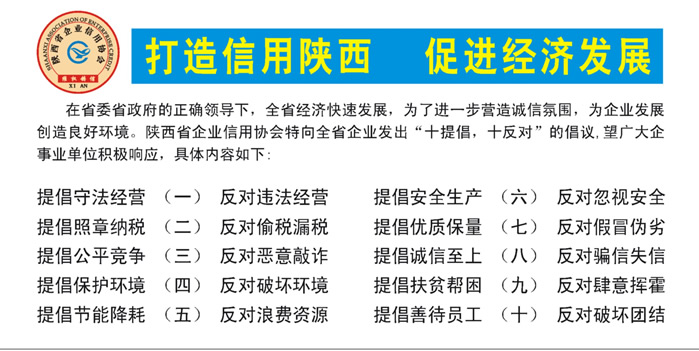 各企事業(yè)單位: 在省委省政府的正確領(lǐng)導(dǎo)下,全省經(jīng)濟快速發(fā)展,為了進一步營造誠信氛圍,為企業(yè)發(fā)展創(chuàng)造良好環(huán)境。陜西省企業(yè)信用協(xié)會特向全省企業(yè)發(fā)出“十提倡,十反對”的倡議,望廣大企事業(yè)單位積極響應(yīng),具體內(nèi)容如下:
